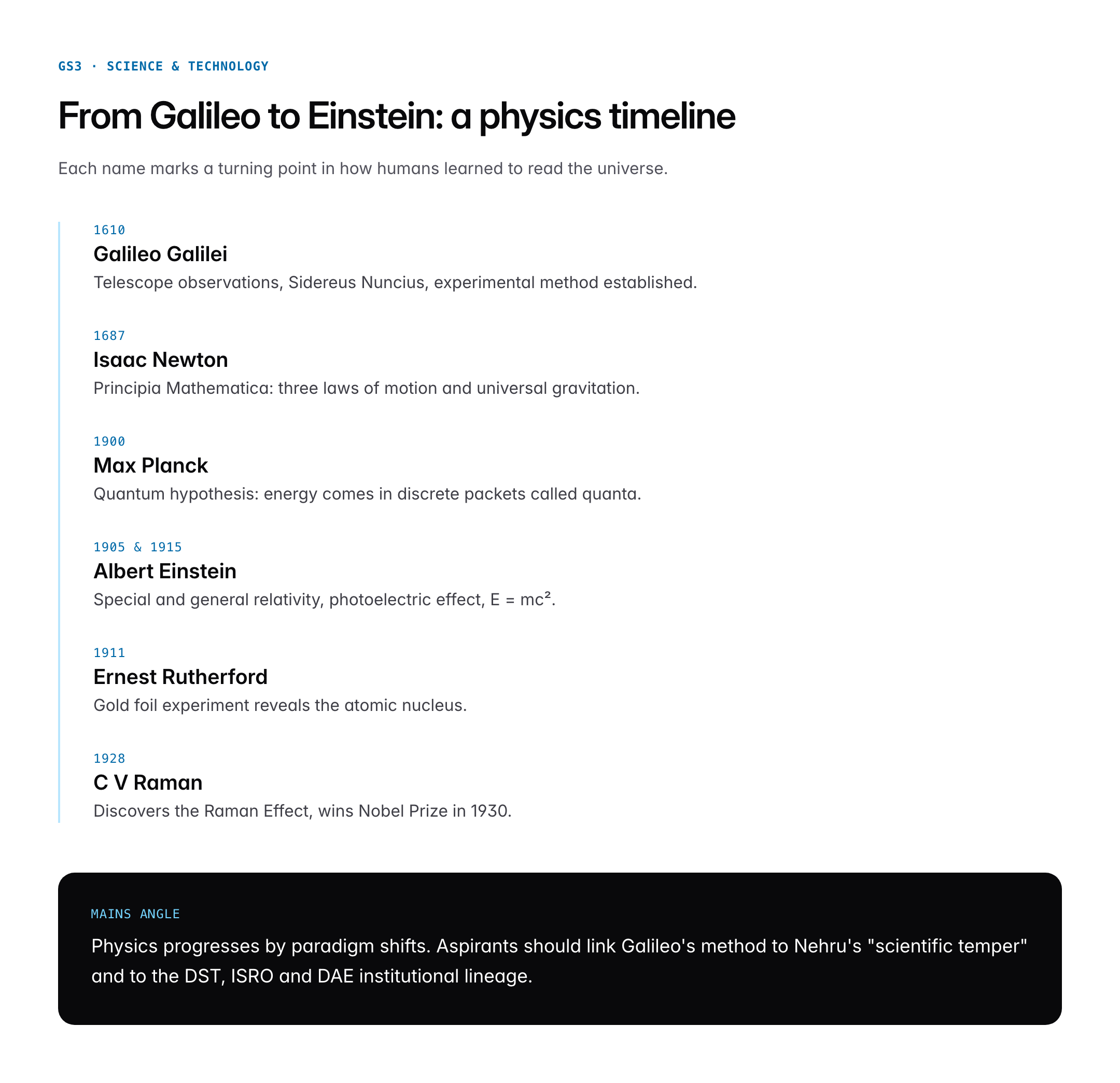 Indian physics grew along this timeline. Jagadish Chandra Bose demonstrated wireless transmission in Kolkata in 1895, before Marconi. C V Raman’s spectroscopic breakthrough of 1928 showed that frontier physics could be done with modest equipment. Meghnad Saha’s ionisation equation of 1920 became essential to astrophysics. Homi Bhabha founded the Tata Institute of Fundamental Research in 1945 and the Department of Atomic Energy in 1954. Vikram Sarabhai launched the Indian space programme. Today, Indian scientists contribute to LIGO, the Large Hadron Collider and ISRO’s astronomy missions, continuing a lineage that began with Galileo’s first telescope.
