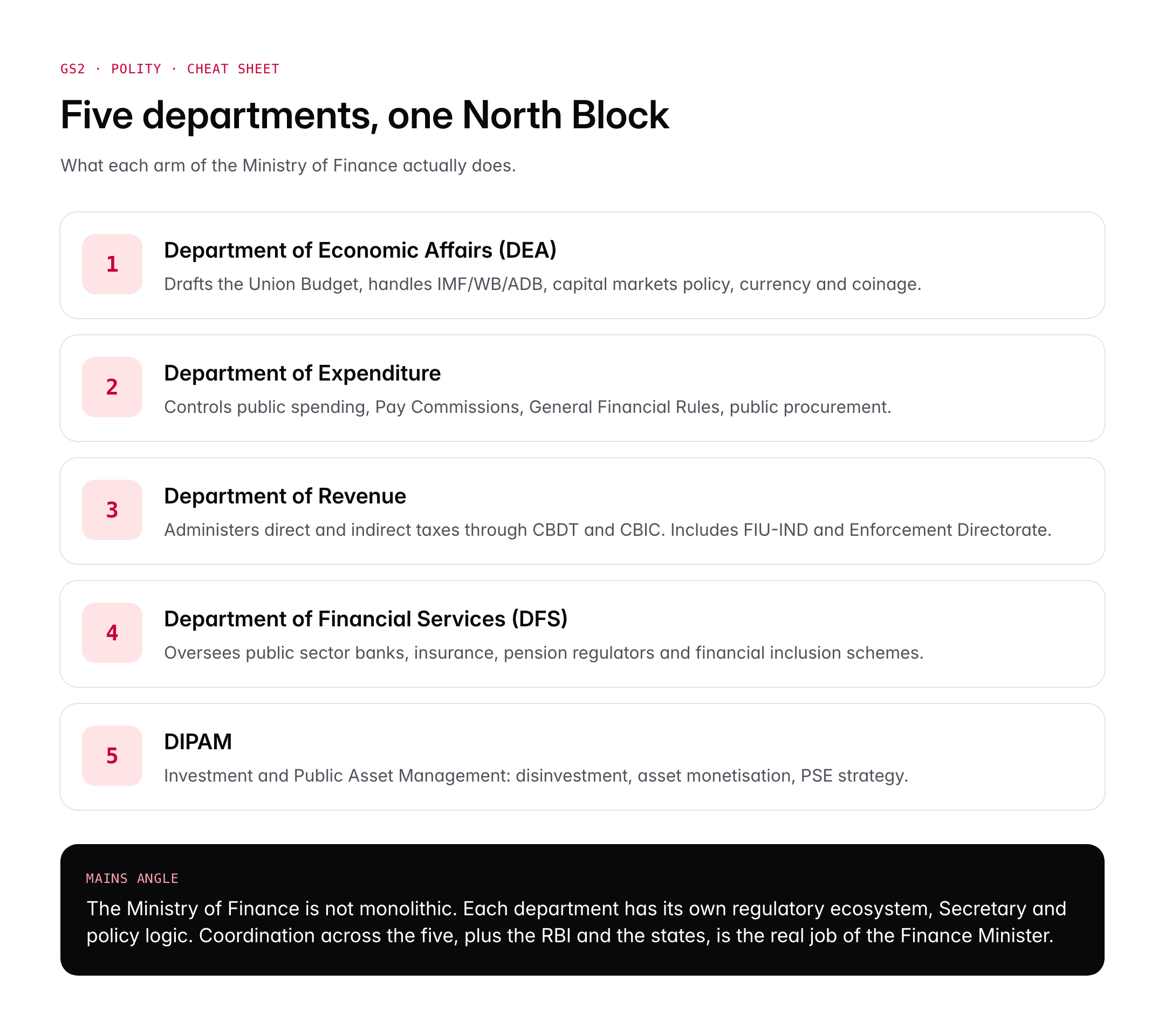 The Finance Minister bridges GS2 polity and GS3 economy. The post intersects constitutional provisions, Budget process, fiscal federalism, Finance Commission relations, GST Council chairing and RBI coordination, making it a high-yield topic for Prelims and Mains across multiple subject areas.