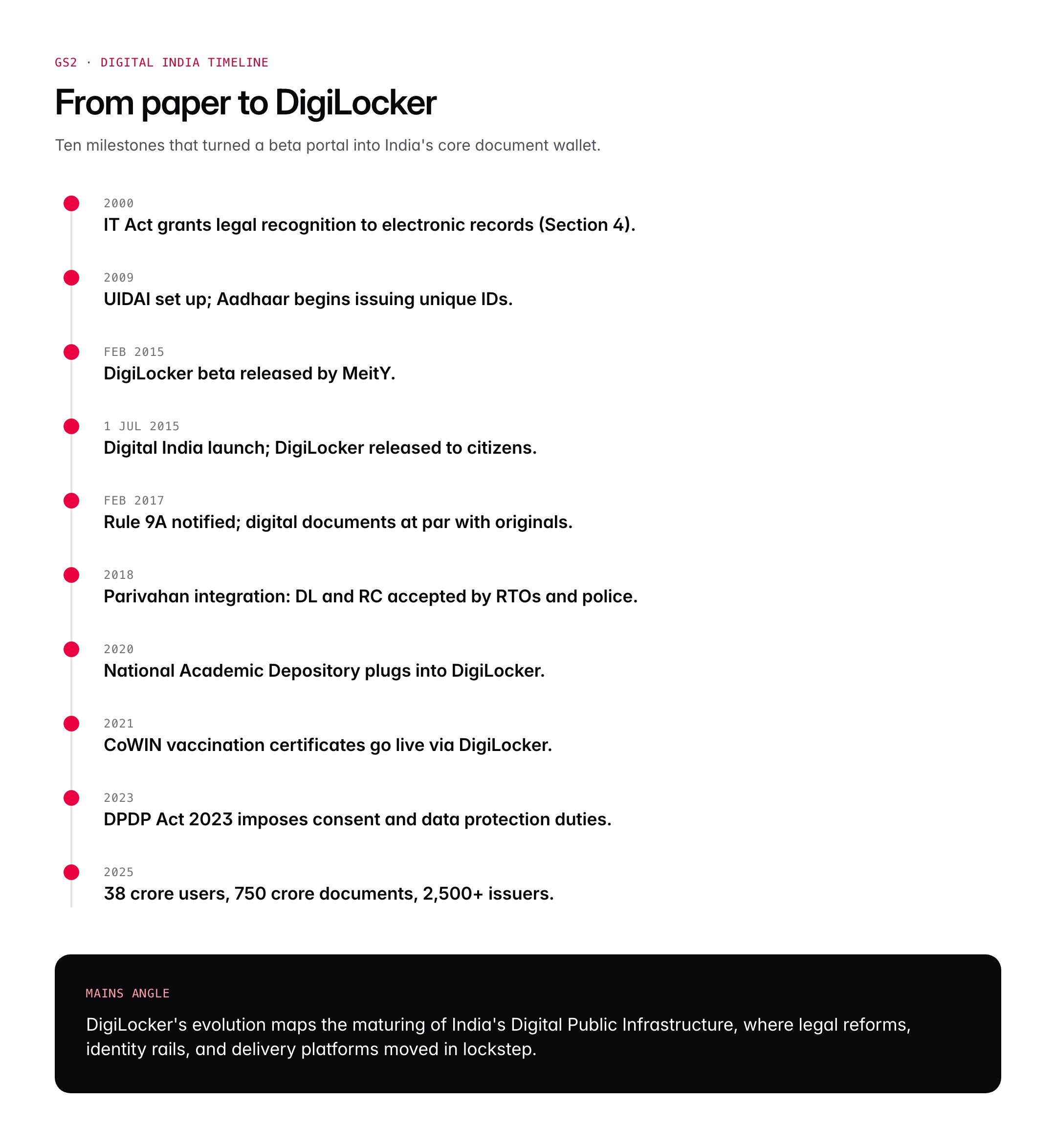DigiLocker is a core GS2 case study in e-governance, digital public infrastructure, and citizen-centric administration. It operationalises Section 4 of the IT Act 2000, connects to Aadhaar and UPI in the India Stack, and illustrates federal cooperation between MeitY, state governments, and regulators. It routinely appears in Prelims factual questions and Mains answers on Digital India.